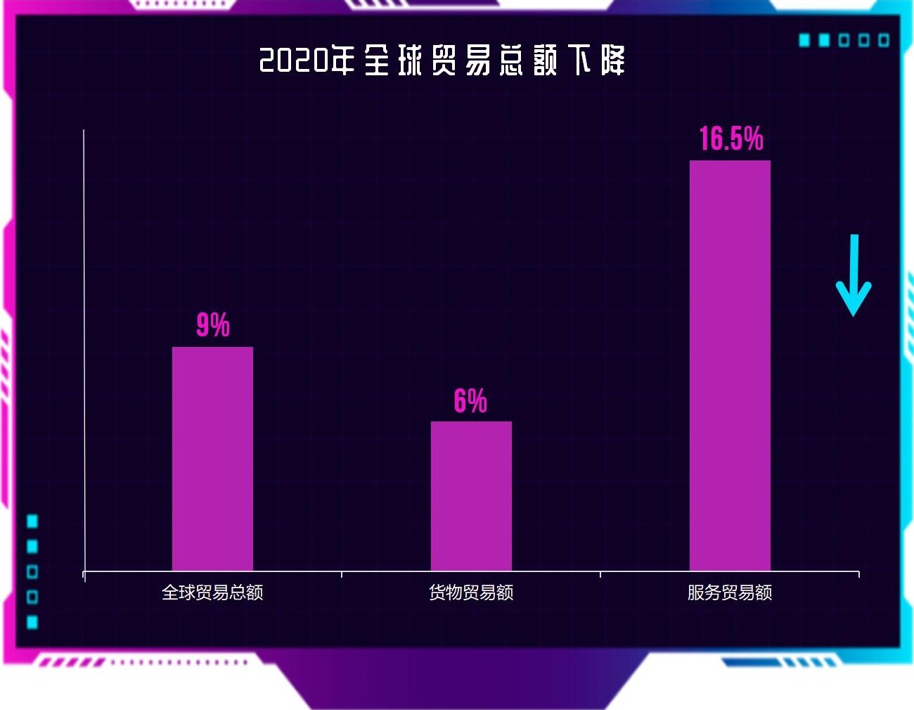 贸发会议数据显示,受新冠疫情影响,2020年全球贸易总额下降约9%,其中货物贸易额下降约6%,服务贸易额下降约16.5%。