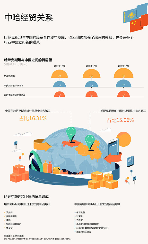 中国提出的一带一路倡议和哈萨克斯坦的光明之路新经济政策非常契合,对接顺畅。目前双方正在落实的双边合作投资项目共计55个,涵盖工业、建筑业、肉类与粮食加工等多领域,其中15个项目已经建成,另有11个项目将于今年投产。这些项目可望为哈萨克斯坦创造成千上万个就业岗位。