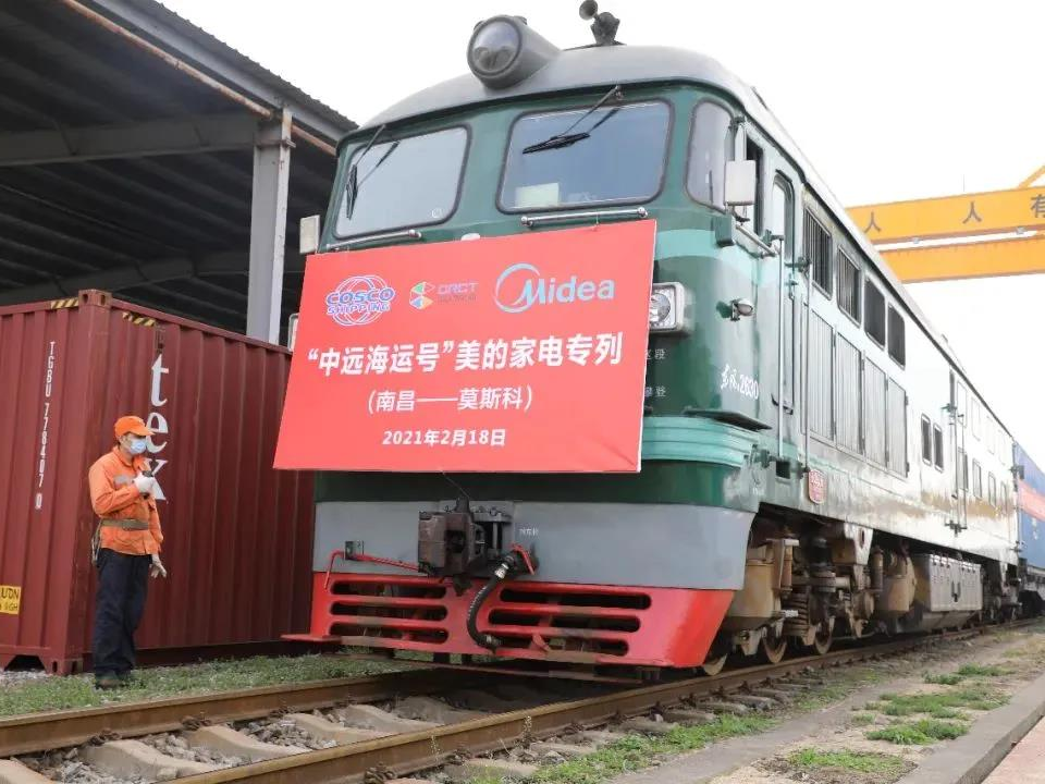 2021年2月18日,随着鸣笛声响起,满载50车电器的中欧班列专列由南昌向塘国际陆港横岗站驶出,预计15天后抵达俄罗斯莫斯科。这也是江西省开行中欧班列以来,首次为家电企业开行的出口专列,班列货价约148万美元。