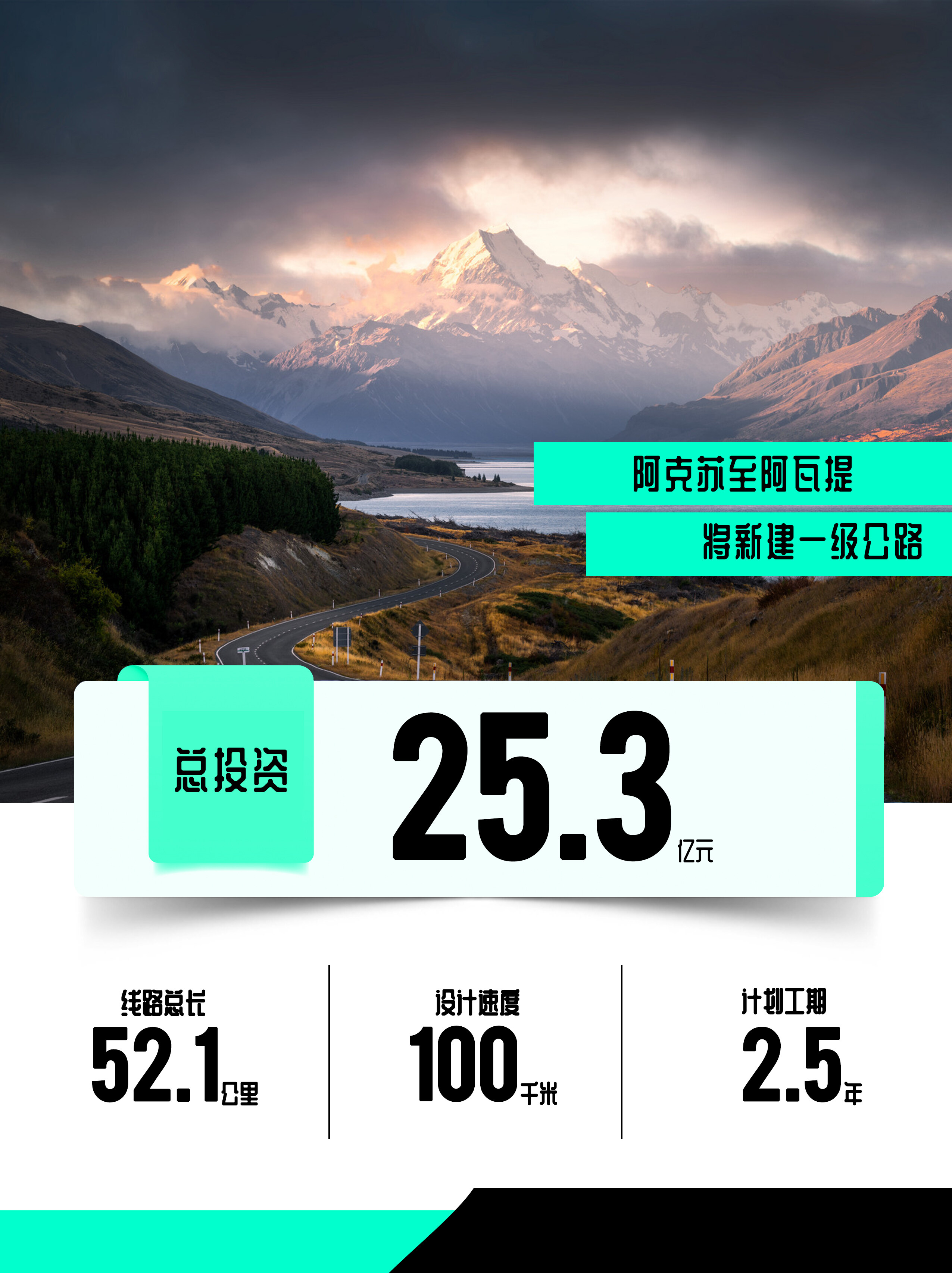 项目起点位于G314阿克苏过境段公路交叉点东北方向,终点与阿瓦提县至兵团一师7团公路项目相接,采用一级公路设计标准,线路总长52.088公里,项目估算总投资25.3亿元,计划工期两年半。