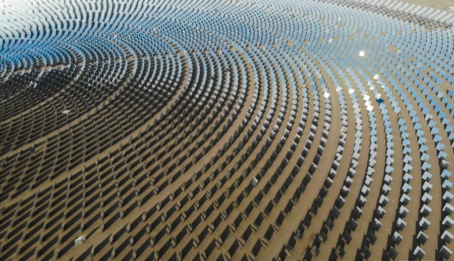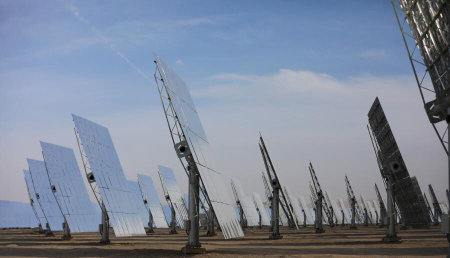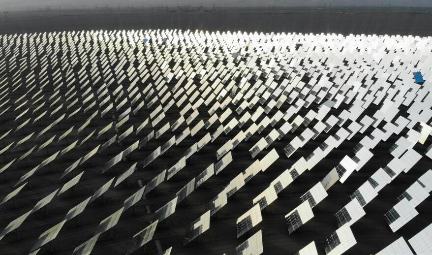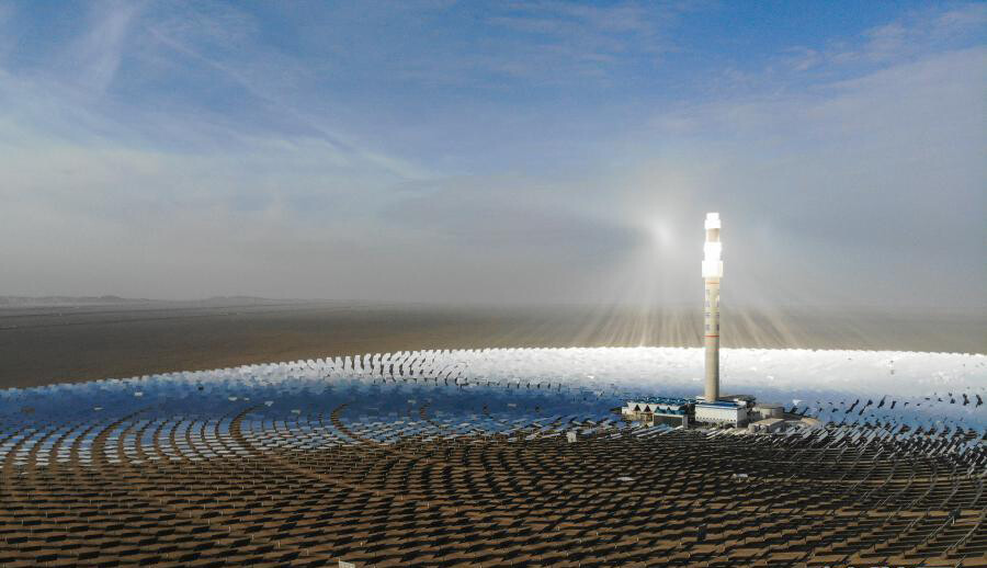 在河西走廊的西端,距离甘肃省敦煌市向西约20公里处,中国目前建成规模最大、吸热塔最高、可24小时连续发电的100兆瓦级熔盐塔式光热电站在戈壁滩上闪耀,该发电站被称为“超级镜子发电站”。电站内的1.2万多面定日镜以同心圆状围绕着260米高的吸热塔,镜场总反射面积达140多万平方米,设计年发电量达3.9亿千瓦时,每年可减排二氧化碳35万吨,是中国目前建成规模最大、吸热塔最高、可24小时连续发电的100兆瓦级熔盐塔式光热电站。