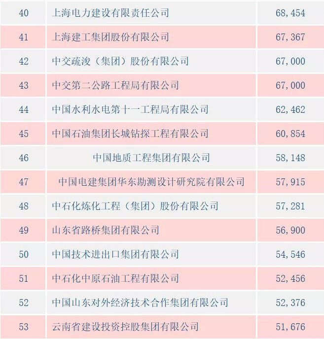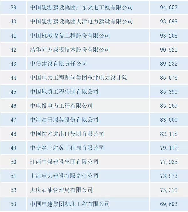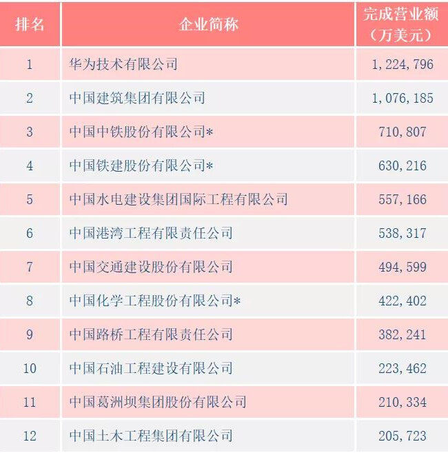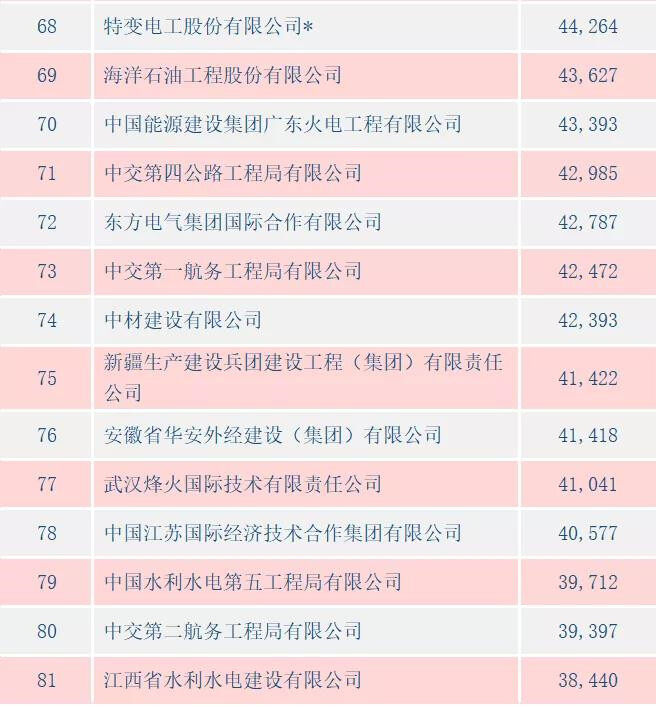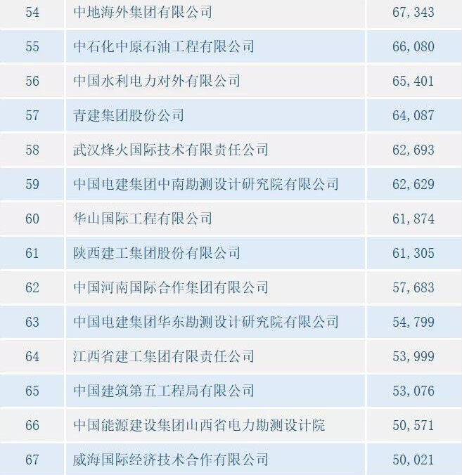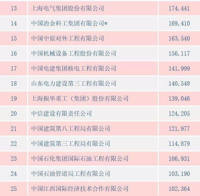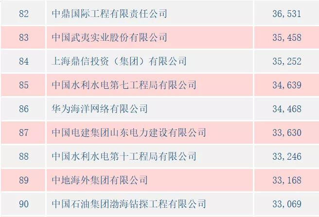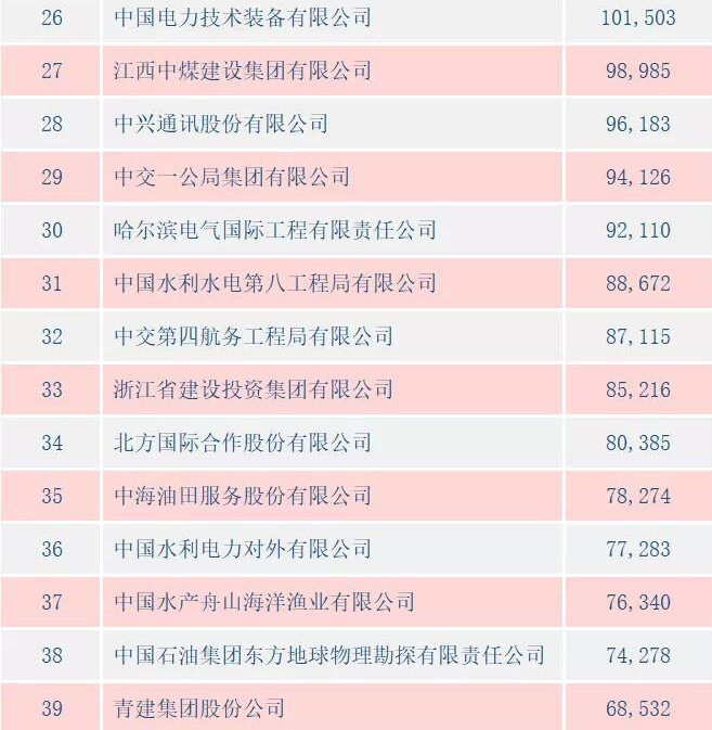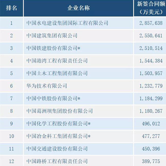 从新签合同额看,虽然整体下降,但头部公司的签署金额创造了历史新高:新签合同额超过200亿美元的有3家,分别是:中国水电、中国建筑、中国铁建;新签合同额在100亿-200亿美元的有5家,分别是:中国港湾、中土、华为、中国中铁、葛洲坝。前3家的新签合同额占到了100强合同额的30.9%,远超去年的20.6%,行业聚集度显著提高;相比之下,行业100强的后10名相加的新签合同额仅占行业1%左右,权重进一步下挫。