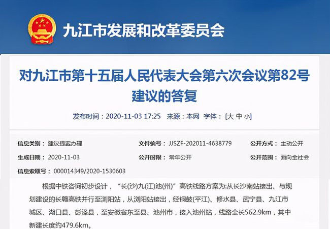 近日,九江市提出将新建一条高速铁路——长沙经九江至池州高铁,“十四五”争取开工。