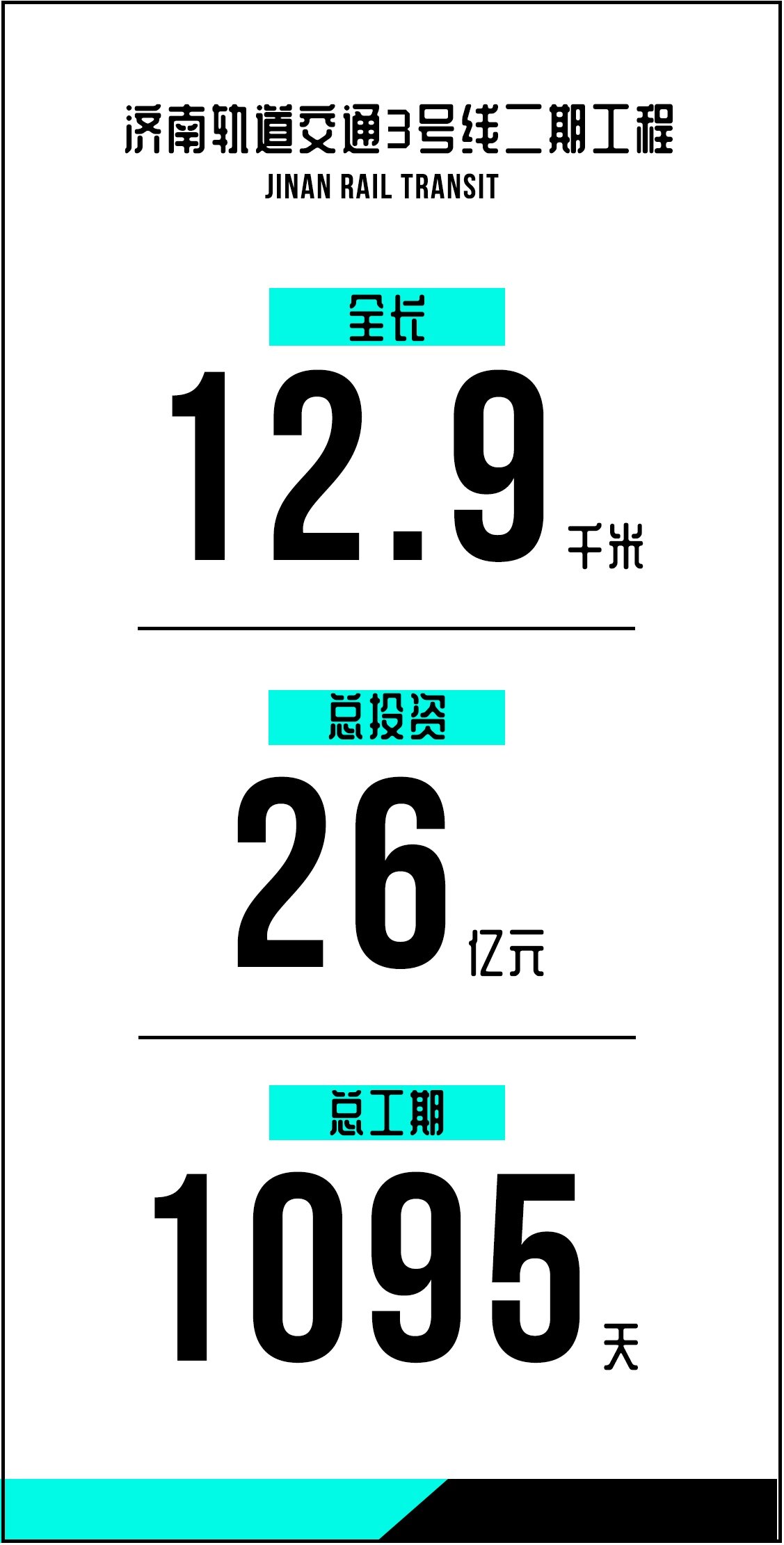 2021年3月3日,济南市城乡交通运输局发布济南轨道交通3号线二期工程施工总承包预中标公示,招标人为济南轨道交通集团建设投资有限公司,由中铁十局集团有限公司以26亿斩获该项目。项目规模12.9km,计划工期1095天。
