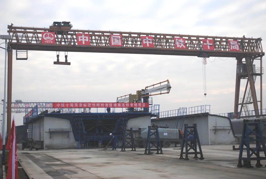 菏泽制梁场位于菏泽市牡丹区皇镇乡邢楼村,占地152亩,共设置10个制梁台座、50个存梁台座。此次浇筑的高铁箱梁长32.6米,重800多吨,共浇筑混凝土316立方米,耗时近6小时。