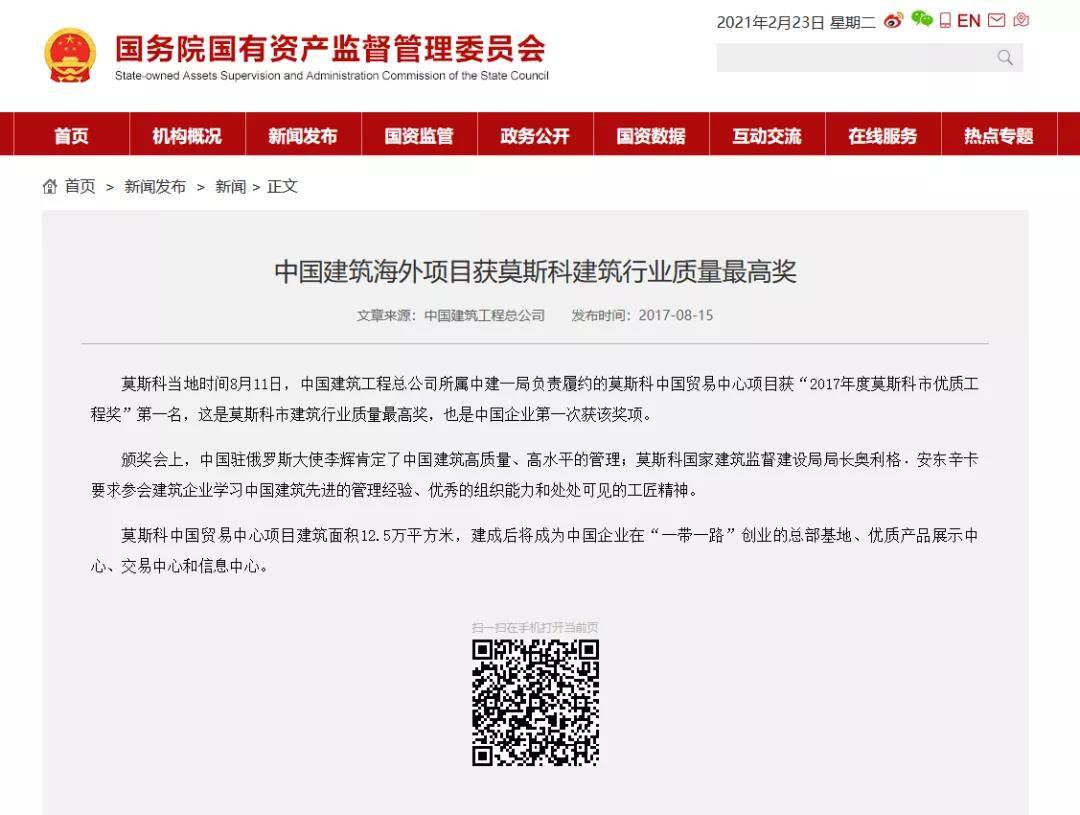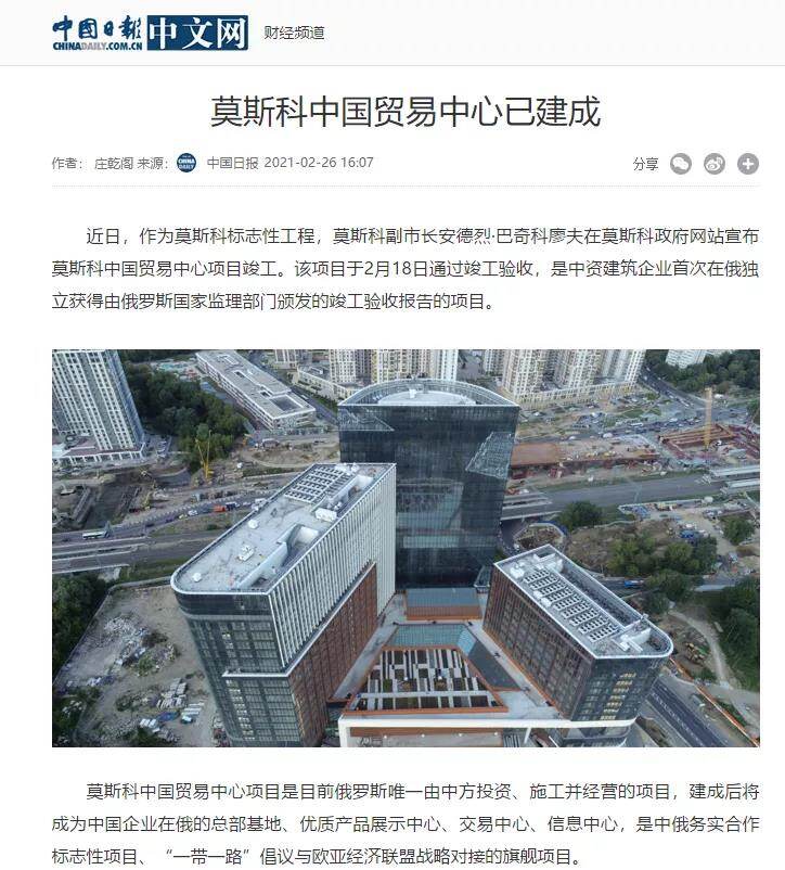 近日,作为一带一路上的标志性项目,由中国建筑旗下中建一局承建的莫斯科中国贸易中心项目竣工验收,并在俄独立获得由俄罗斯国家监理部门颁发的竣工验收报告,以中国方案为中国效率、中国品质代言。