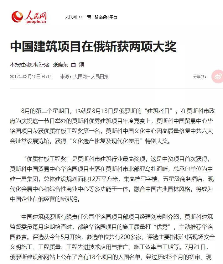As early as August 2017, the project won the first place in the Moscow High-quality Model Project Award, the highest award in the construction industry of Moscow. It is also the first time a Chinese company has won the award. As the only Chinese project recommended by the Moscow State Construction Supervision Committee, it has been awarded from more than 200 Out of more than 1,000 projects from a construction company.