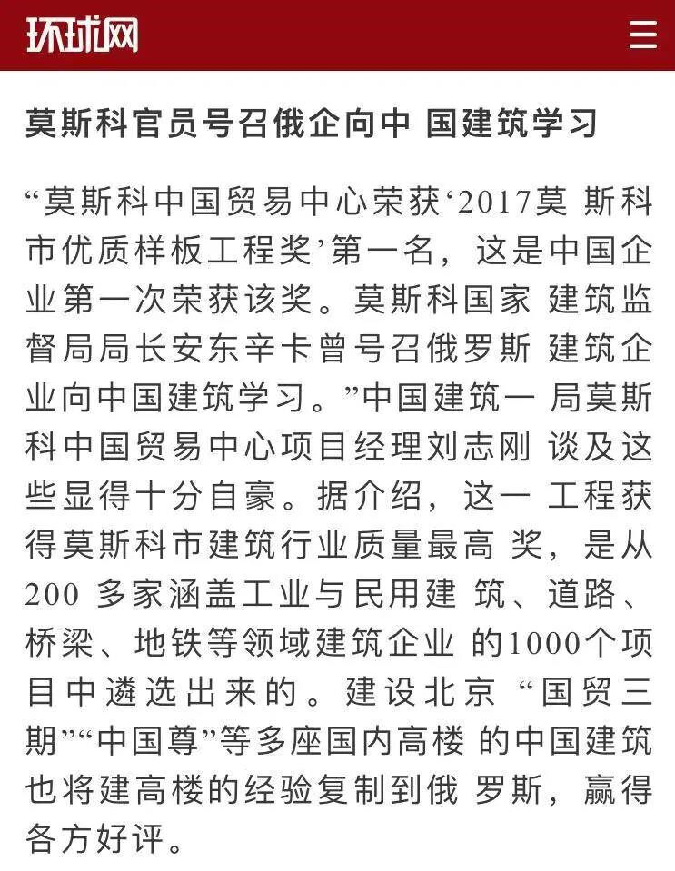"Everyone should learn from the advanced management experience of Chinese construction, excellent organizational skills and ubiquitous craftsmanship." said Olig Antonsinka, director of the Moscow State Construction Supervision and Construction Bureau.