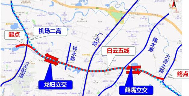 白云五线(G106国道-大源北路)工程属于规划白云五线其中的一段,路线起点与白云五线(机场高速公路-G106国道)段工程相接,终点接入大源北路,路线与广州新白云国际机场二高公路共用路线走廊带,自西往东分别与G106国道、钟永路、新广从快速路、陈太路相交。于白云五线-G106国道节点设置互通立交,并在钟永路、新广从快速路设置跨线桥,终点接大源北路节点设置近期南转西左转匝道及远期西转北匝道。