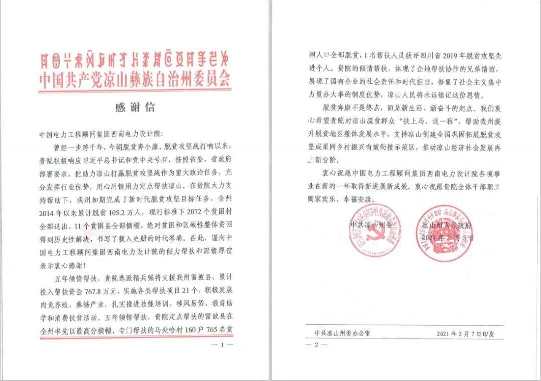 新春伊始,中国能建规划设计集团西南院收到一封来自中共凉山州委、凉山州人民政府的感谢信,对西南院在凉山州打赢脱贫攻坚战中给予的支持和帮助表示衷心感谢。