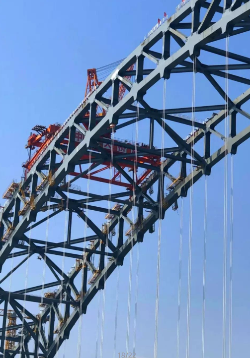 目前汉江湾桥建设已进入收尾阶段,包括桥头堡的施工、附属工程安装,以及各种施工设备的拆除等。2台拱上架梁吊机是收尾工作的主力,看,就是“趴在”拱上那个橘红色的建桥神器。