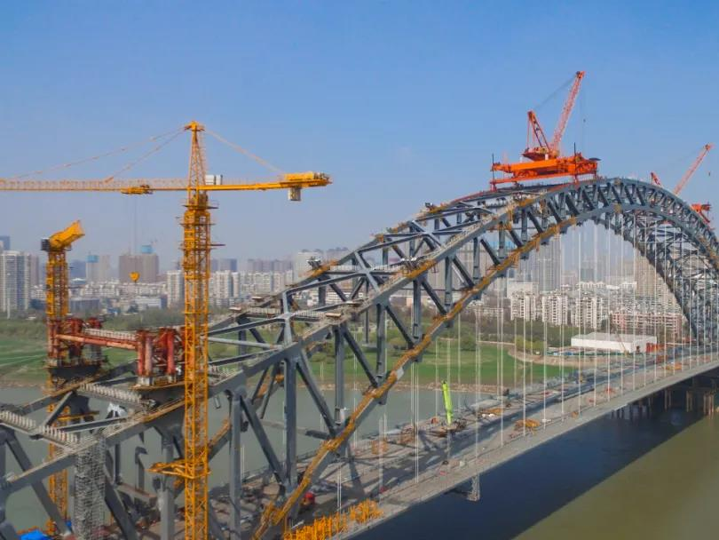 它们是中铁大桥局最新研制的重载大角度爬坡设备,可以在最大坡度将近30度的坡面,吊起重达100吨的拱肋桁架杆件。大桥钢拱架设全靠它。在架设汉江湾桥的钢拱时,它们分别从汉阳、汉口两侧开始,一点点地向桥中央“爬行”,最终实现拱的合龙。合龙后,它们又要反其道而行,从中间开始,分别向两侧“退下来”。在退行过程中,吊机要完成两个任务:一是拆除施工平台和设备,二是安装拱上的检修通道。目前吊机正以3天退行2个节段的速度行进,退出后也就意味着桥梁主体工程基本完工。