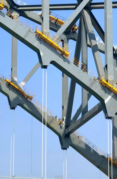 They are the latest heavy-duty and large-angle climbing equipment developed by China Railway Bridge Bureau, which can lift up to 100 tons of arch rib truss members on slopes with a maximum slope of nearly 30 degrees. The erection of the steel arch of the bridge relies on it. When erecting the steel arches of the Hanjiang Bay Bridge, they started from both sides of Hanyang and Hankou, and "crawled" towards the center of the bridge little by little, and finally closed the arches. After closing the dragon, they have to go the other way, starting from the middle and "retreating" to both sides respectively. In the process of retreat, the crane has to complete two tasks: one is to dismantle the construction platform and equipment, and the other is to install the overhaul channel on the arch. At present, the crane is traveling at the speed of retreating 2 sections in 3 days. After retreating, it means that the main bridge project is basically completed.