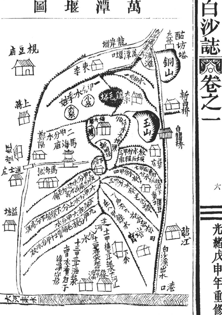 在近2000年的治水实践中,智慧的先民积累了丰富的管理和岁修经验。官府制定堰帖,明确各堰水权和工程岁修责任,指导三十六堰的协同运行,保证干旱月份上下游各堰的公平用水。在这份清光绪三十四年重修的《万潭堰帖》中,清晰地绘制了万潭堰灌区渠系布局图,列出了堰址、配水系统以及引水灌溉计划。