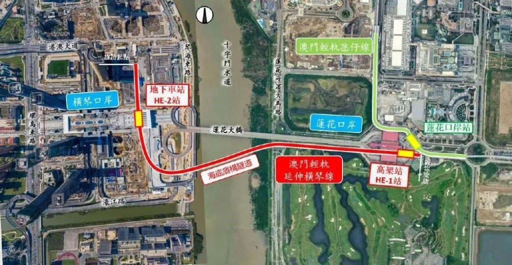 澳门轻轨延伸横琴线主体建筑由高架桥、河底隧道及两个车站组成,全长约2.2公里,其中隧道段约900米。起于澳门轻轨氹仔线莲花大桥站旁的HE1站(高架站),出站后沿莲花大桥方向逐渐下降,以河底隧道方式穿过十字门水道进入横琴,最终止于横琴口岸地库下层HE2站(地下站)。