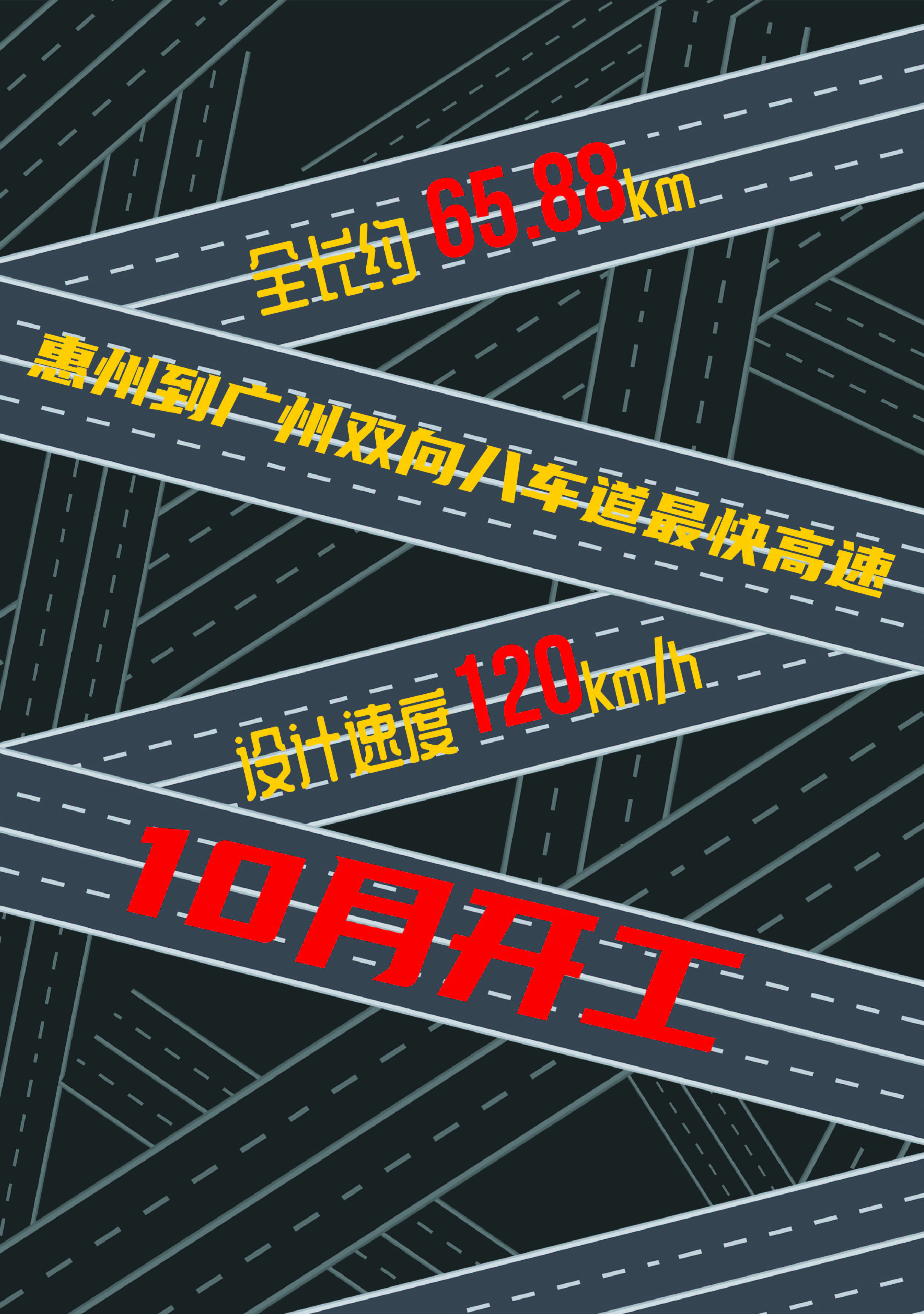 该高速起于惠州汤泉,与惠湾高速对接,终于广州增城石滩镇,与花莞高速对接,路线全长约65.88km(其中惠州界内里程长度约57.88km,广州界内里程长度约为8.0km),拟采用双向八车道高速公路标准建设,设计速度120km/h(起点段局部100km/h)。