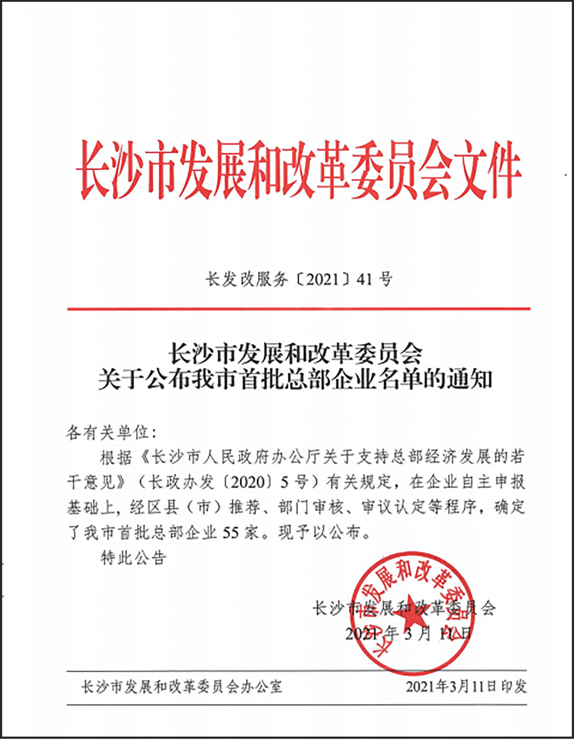 2020年,长沙出台并实施《长沙市人民政府办公厅关于支持总部经济发展的若干意见》,随后,长沙市发展和改革委员会发布实施细则,并启动2020年度长沙市总部企业认定工作,最终从100余家申报企业中认定了55家企业,入选长沙首批总部企业名单。获评长沙总部企业,可享受长沙市住房保障、子女入学、人才户籍、人才绿卡等方面的服务便利,以及办公用房补贴、创新奖励等,最高奖励5000万元。