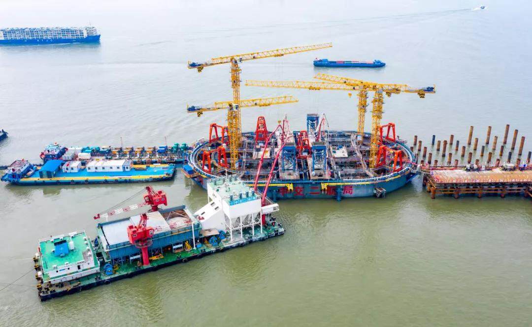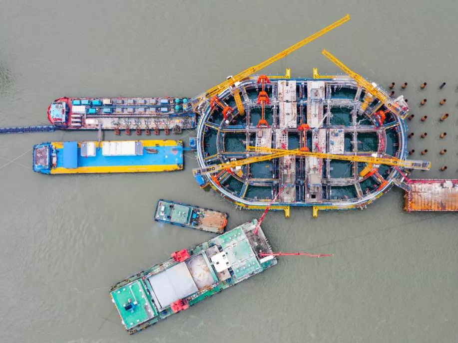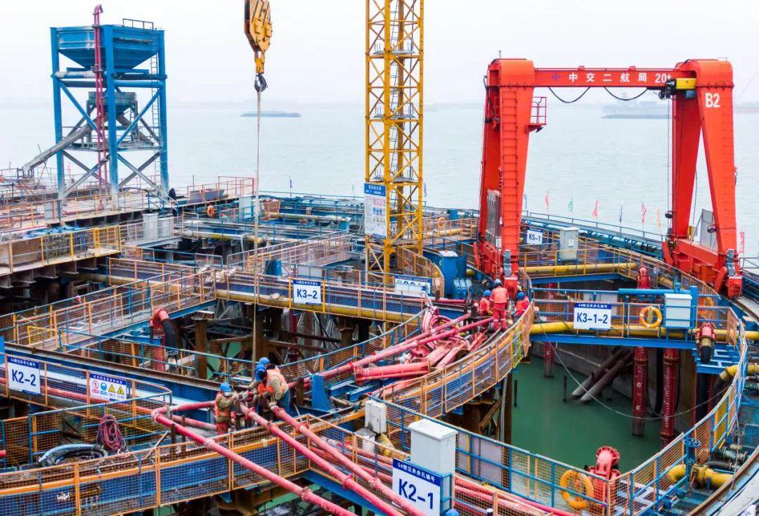 2021年3月9日中交二航局承建的长江上首座集,高速公路、城际铁路、一级公路“三位一体”的过江通道常泰长江大桥5号主墩钢沉井,封底混凝土浇筑完成,这是目前世界在建最大水中钢沉井基础。