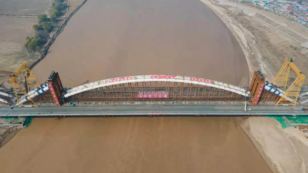 3月15日重达6800吨的主跨300米拱肋整体提升完成,至此由中交二公局承建的齐鲁黄河大桥,主桥420米跨拱肋合标志着世界最大,下承式网状系杆拱桥主跨合龙跨黄通道建设再进一步。本次拱肋整体提升、合龙一次性创下了四项“第一”:桥梁工程三段法作业中提升重量世界第一,其整体提升重量6800吨,大约相当于220架波音737飞机的重量;在黄河上首次采用提升合龙技术;世界桥梁中首次采用不单独设置合龙段进行拱肋提升合龙作业;世界上最大下承式网状系杆拱桥主跨合龙完成,是名副其实的“黄河第一拱、世界第一吊”。