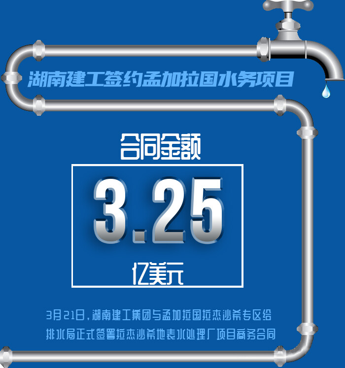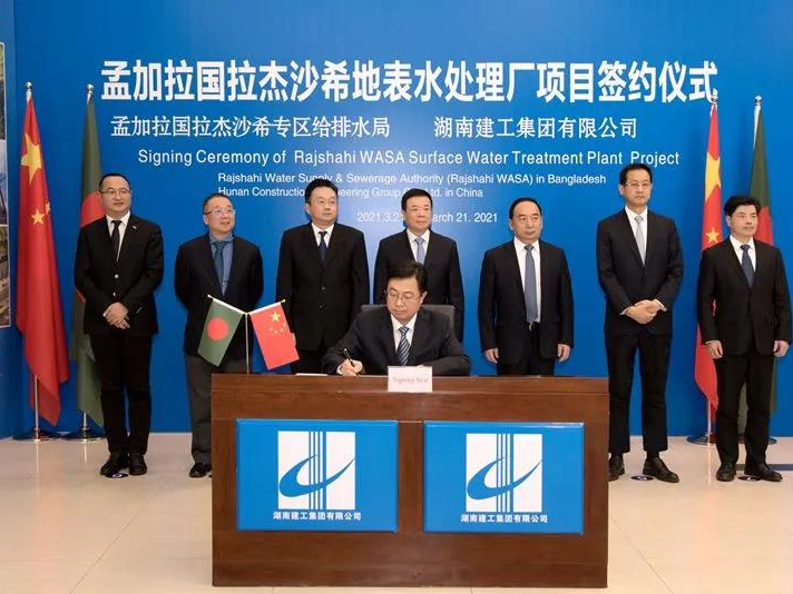 孟加拉国是一带一路孟中印缅经济走廊的重要节点,2021年3月21日,湖南建工集团与孟加拉国拉杰沙希专区给排水局正式签署拉杰沙希地表水处理厂项目商务合同,项目EPC合同金额3.25亿美元。主要建设内容为取水口、水处理厂、双根球墨铸铁管输水干管、加压泵站及一二级配水管网,项目工期为48个月。