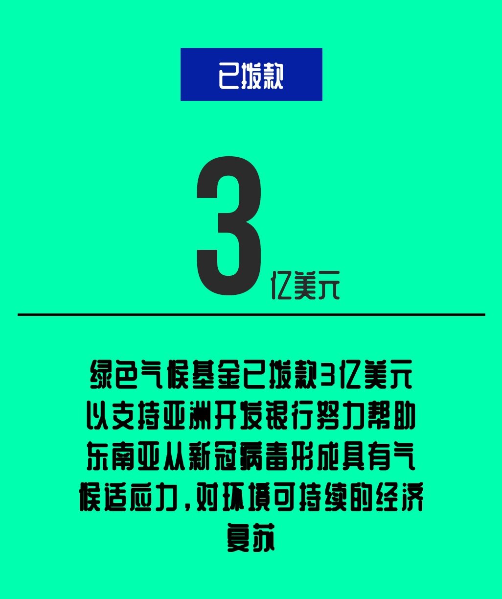 2021年3月22日,绿色气候基金已拨款3亿美元,以支持亚洲开发银行努力帮助东南亚从新冠病毒形成具有气候适应力,对环境可持续的经济复苏。