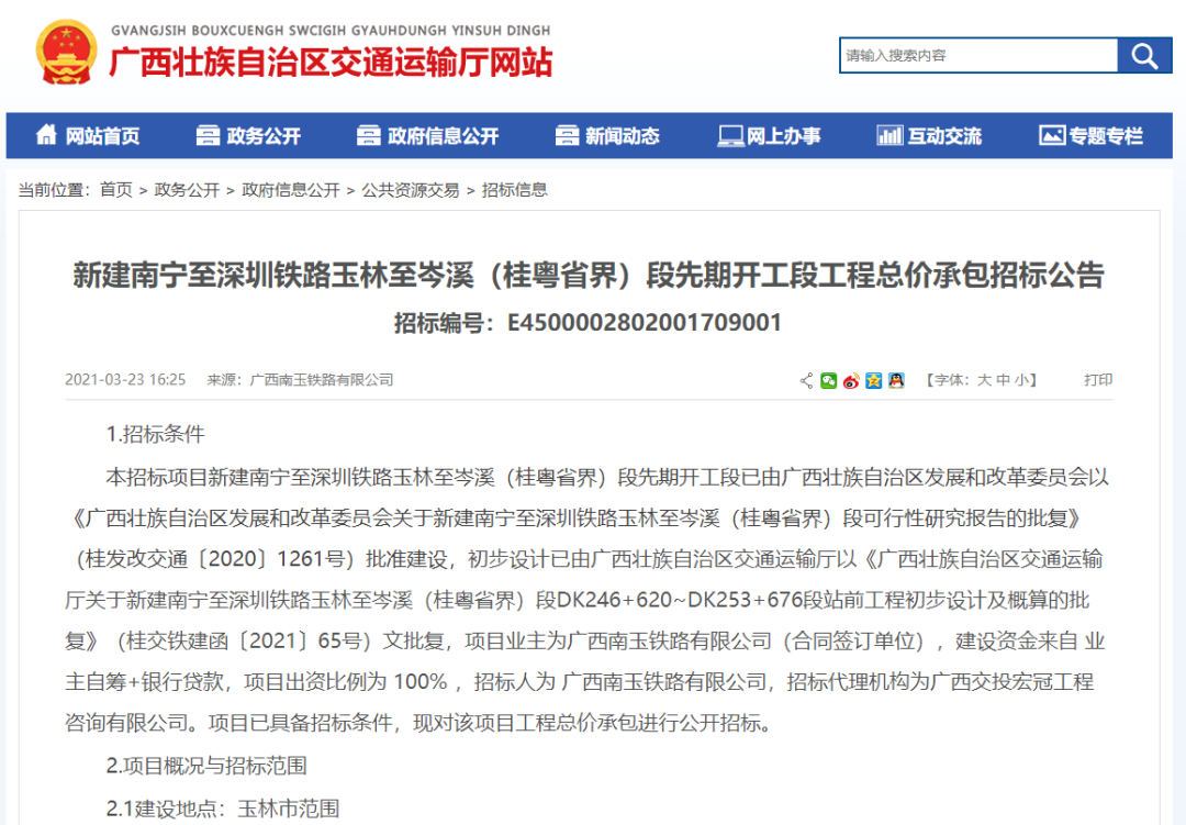 新建南宁至深圳铁路玉林至岑溪(桂粤省界)段先期开工段已由广西壮族自治区发展和改革委员会以《广西壮族自治区发展和改革委员会关于新建南宁至深圳铁路玉林至岑溪(桂粤省界)段可行性研究报告的批复》(桂发改交通〔2020〕1261号)批准建设,初步设计已由广西壮族自治区交通运输厅以《广西壮族自治区交通运输厅关于新建南宁至深圳铁路玉林至岑溪(桂粤省界)段DK246+620~DK253+676段站前工程初步设计及概算的批复》(桂交铁建函〔2021〕65号)文批复,项目业主为广西南玉铁路有限公司(合同签订单位),建设资金来自 业主自筹+银行贷款,项目出资比例为 100% ,招标人为 广西南玉铁路有限公司,招标代理机构为广西交投宏冠工程咨询有限公司。