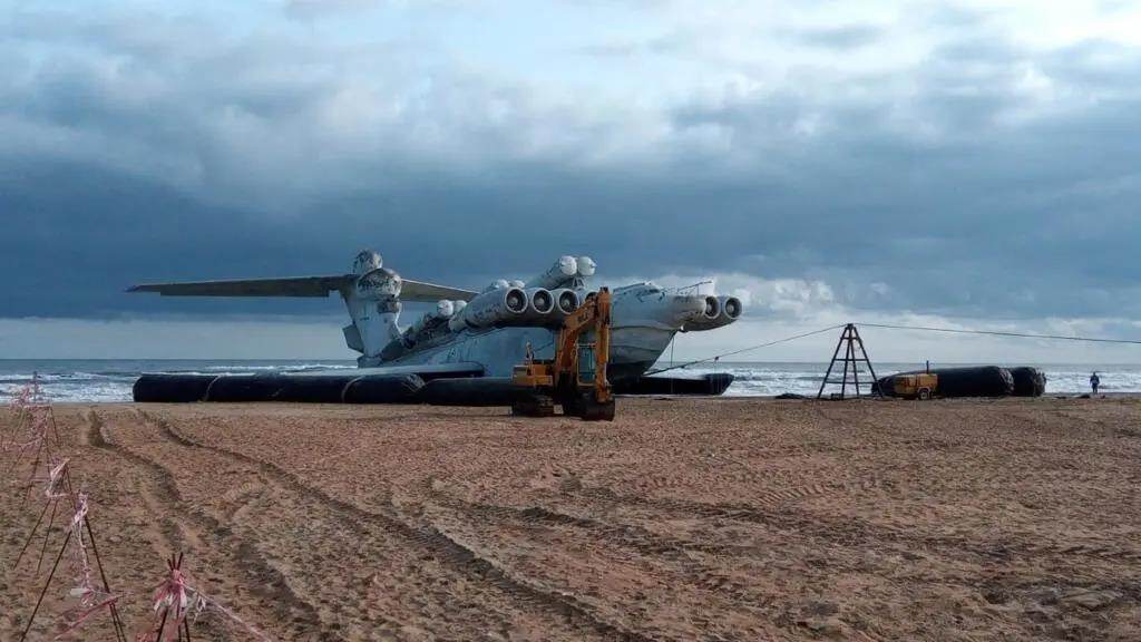 视频里海滩上躺着一架庞大的航天怪物,我们先正式讲一下这个里海怪物的真正来历,它是由前苏联阿列克谢耶夫中央设计局下属伏尔加造船厂于1963年建造的地效飞行器,名称Лунь,发音做“卢恩”,也就是鹞的意思,当然,这只鹞的体量实在是太大了,长106米,重495吨,这样的庞然大物能够运动靠的是“翼地效应”:8台涡轮风扇发动机每一个都能产生12万7千牛的推力!KM为俄文“原型机”缩写。西方国家通过卫星照片发现了KM地效飞行器,由于外形庞大且发现于里海,所以北约给它起了个绰号“里海怪物”(Kaspian Monster,缩写也是KM)。后来由于苏联解体的原因,这台里海怪物就一直沉寂于里海边,几十年来风吹雨打。