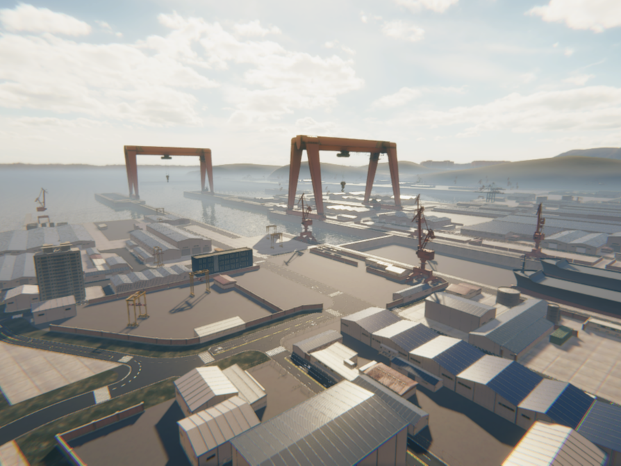 两家公司已经建立了船厂车间和船坞空间规划虚拟仿真平台的开发逻辑,并验证了在Unity中开发该平台并与真实数据交互所需的技术。在技术验证过程中,双方通过对真实船厂数据的可视化完成船厂设施和空间布局的虚拟仿真,真实还原了韩国大宇船厂的虚拟三维模型。此外,通过对船厂内运输工具移动路线和建材堆垛布局优化方案的模拟,船厂伸展面积和建材物流路线规划皆可在平台上检查。