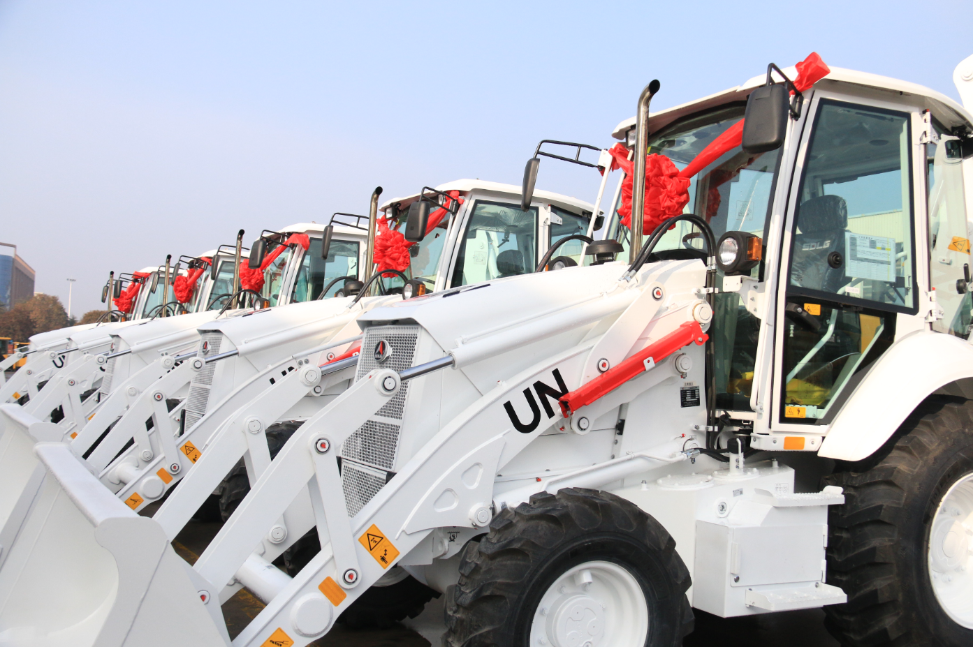 春暖花开时节,5台白色涂装并带有联合国UN标识的临工挖掘装载机,装车出发,踏上参与联合国维和任务的征程。