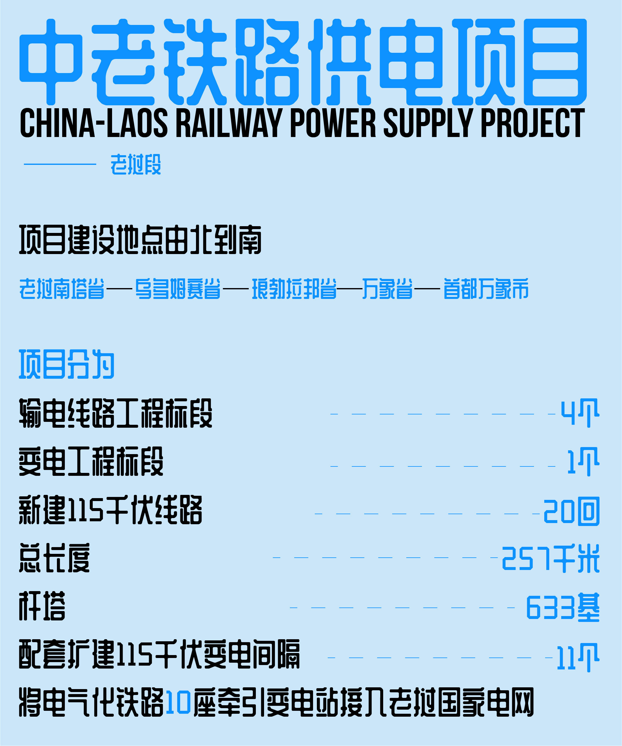 据介绍,中老铁路供电项目于2019年12月30日正式开工建设,项目建设地点由北到南涉及老挝南塔省、乌多姆赛省、琅勃拉邦省、万象省、首都万象市。项目分为4个输电线路工程标段和1个变电工程标段,新建115千伏线路20回,总长度257千米,杆塔633基,配套扩建115千伏变电间隔11个,将电气化铁路10座牵引变电站接入老挝国家电网。