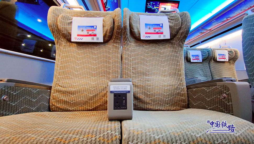 二等座车厢座椅设有靠背调节按钮,旅客可以利用扶手上的调节按钮调整靠背角度;座椅下方的充电口设有两孔、三孔插座和USB接口;小桌板上印有“中国铁路”微信公众号、铁路12306APP二维码,方便旅客关注和下载。