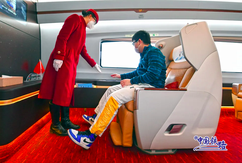 商务车厢的半包式座椅不仅可以调整为半躺、平躺等多种角度,还具有按摩、加热功能。无线充电装置、LED阅读灯、车窗亮度调节按钮等,可为旅客提供优质的差异化服务。