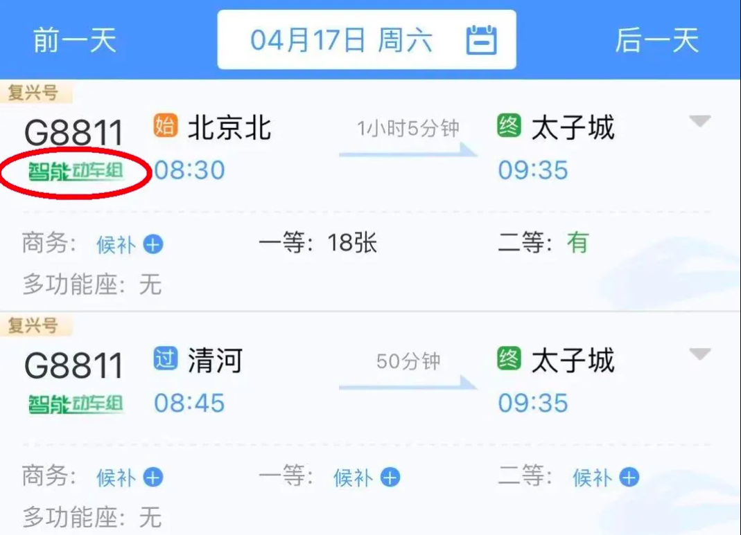 在12306上购买京张高铁车票时,该车型车次下方会有绿色“智能动车组”字样。