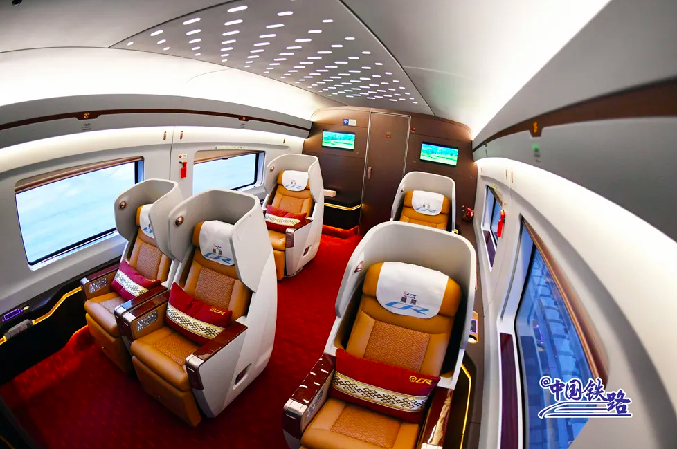 The first-class carriage adopts a 2+2 layout, the seats are wider and more comfortable, and facilities such as power sockets, pedals, coat hooks, and folding tables are all available.