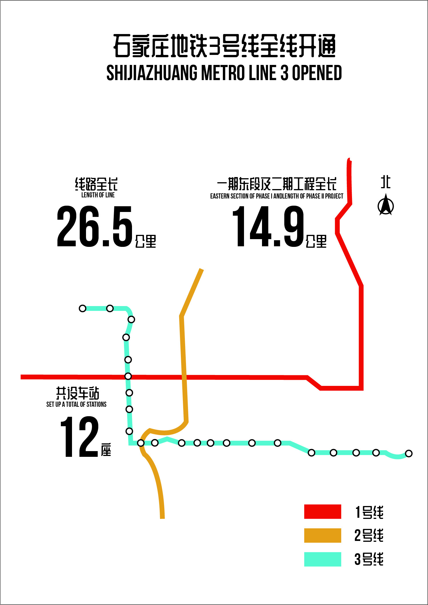 2021年4月6日,石家庄地铁3号线一期东段及二期工程正式开通运营,这标志着石家庄地铁3号线全线通车。至此,石家庄地铁通车里程刷新至76.5公里,开通车站达60座,石家庄市轨道交通包括1、2、3号线在内的一期建设基本建成收官,初步形成市区东西南北贯通的轨道交通骨干网络。