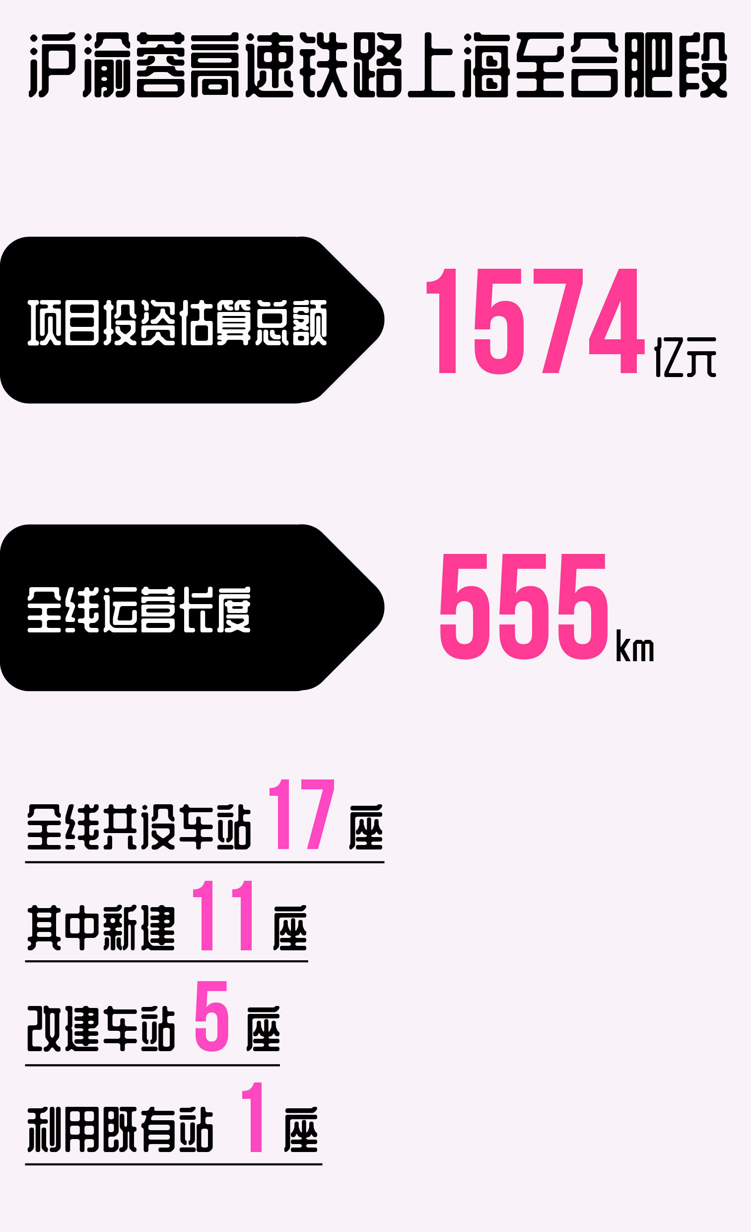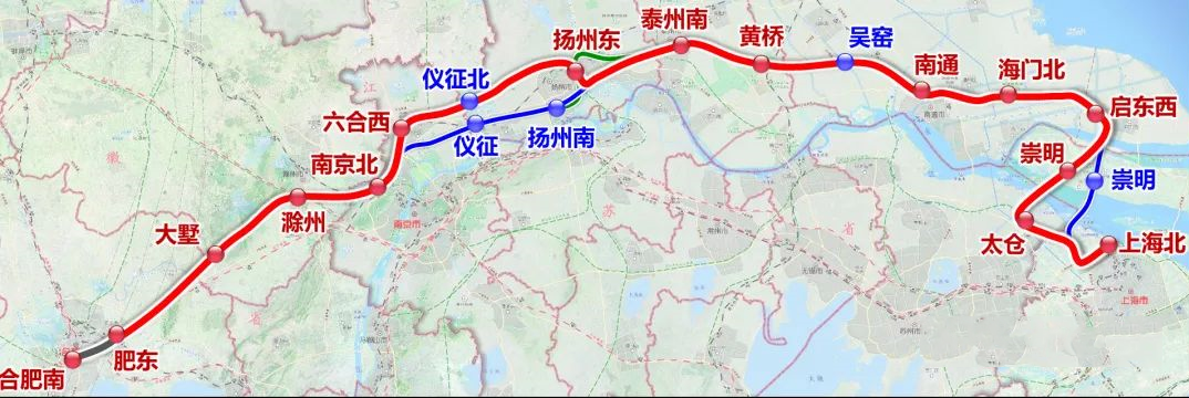 全线共设车站17座,其中新建11座,分别为上海北站、崇明站、启东西站、海门北站、吴窑站、黄桥站、泰州南站、仪征北站、六合西站、南京北站、大墅站;改建车站5座,分别为太仓站、南通站、扬州东站、滁州站、肥东站;利用既有站1座,为合肥南站。工程新建上海北动车运用所与南京北动车运用所,扩建南通动车所,新建扬州东动车组存车场。项目投资估算总额1573. 95亿元。