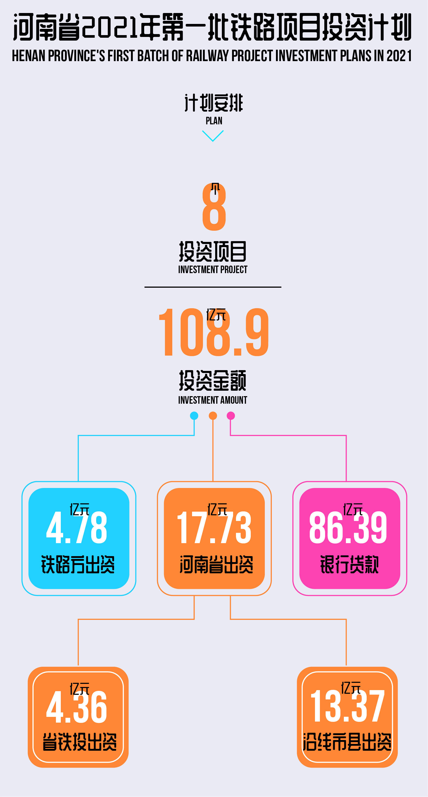 本次投资计划安排8个项目,下达年度投资计划108.9亿元。其中,铁路方出资4.78亿元,河南省出资17.73亿元,银行贷款86.39亿元。河南省出资部分中,省铁投出资4.36亿元,沿线市县13.37亿元。