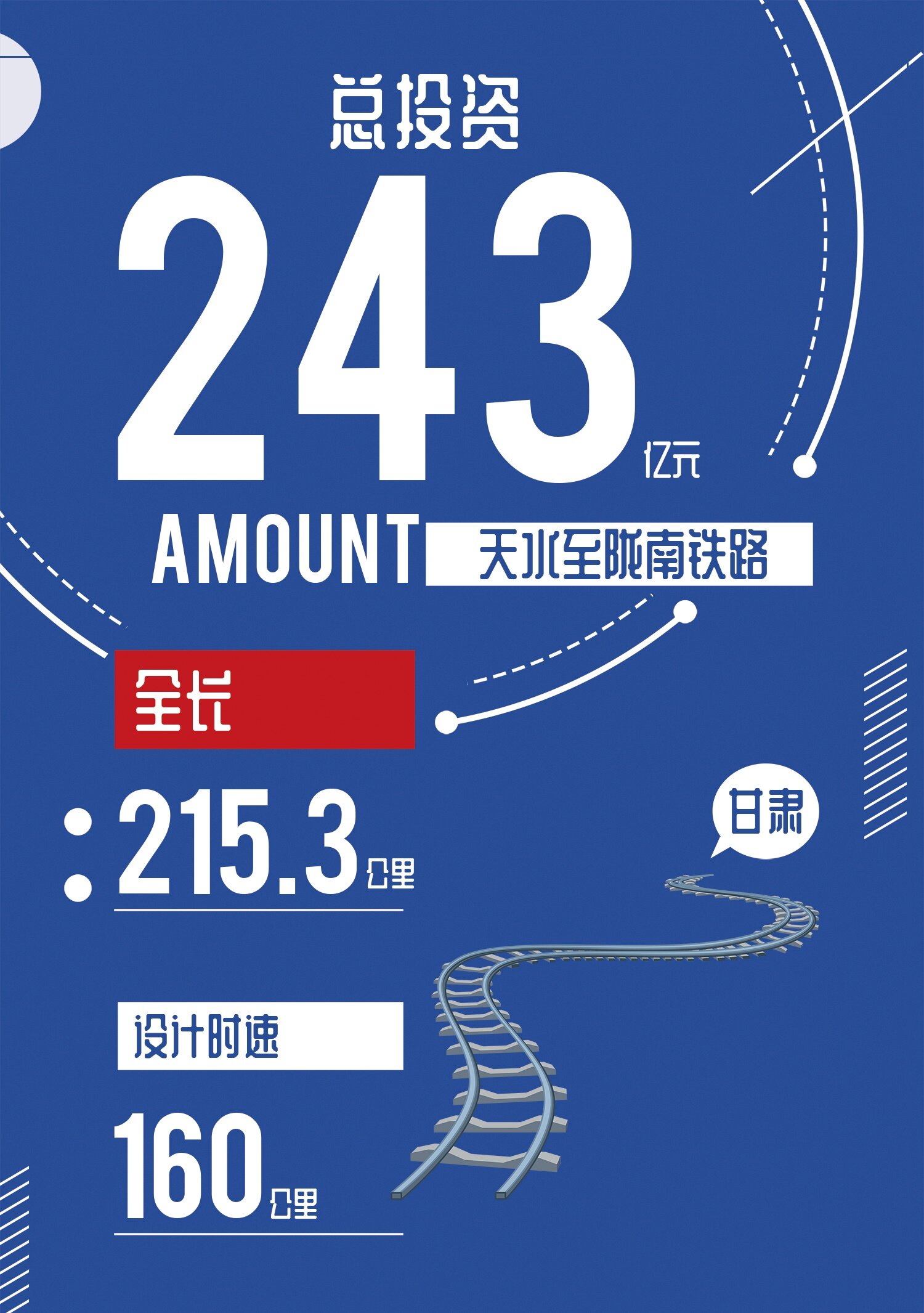 项目总投资约243.23亿元,总长215.3公里,工期5年半,其中天水市境内59.3公里,陇南市境内156公里,设计时速160公里/小时。2020年11月24日,项目先期开工段正式开工建设。