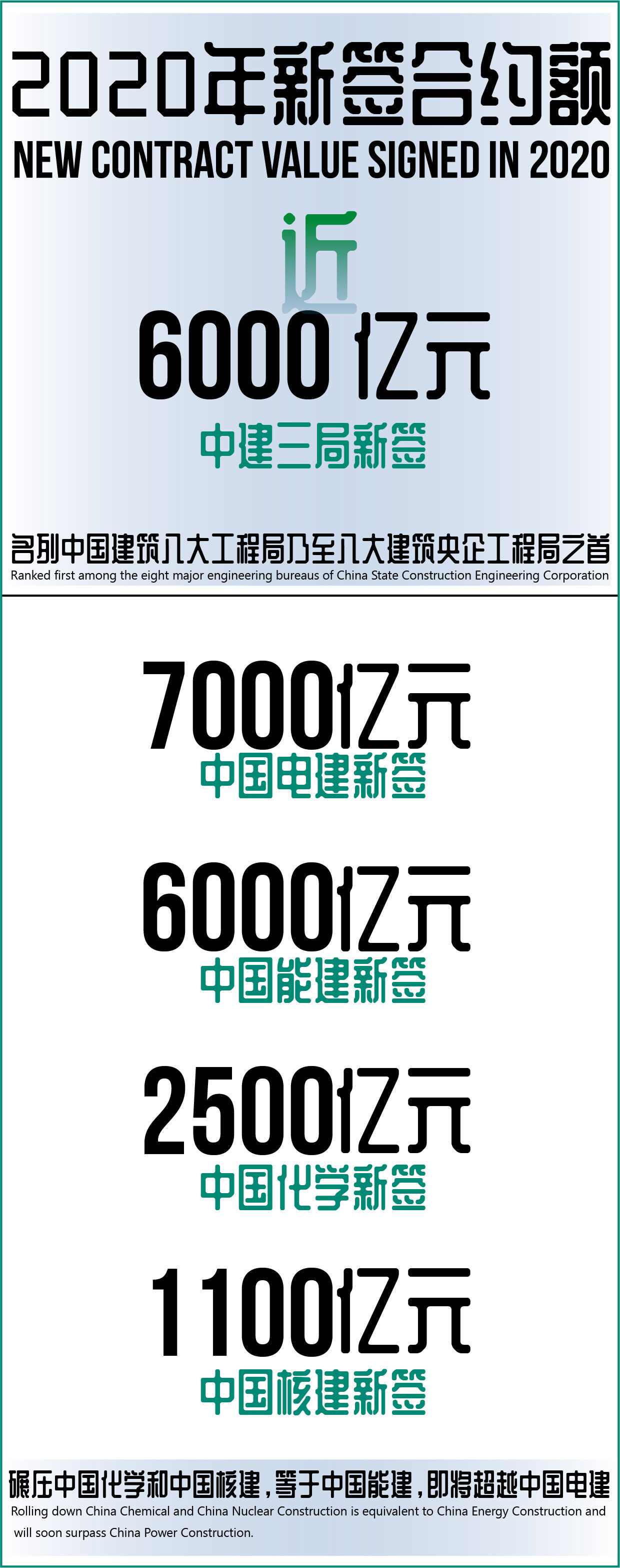 一年新签合同额什么概念?通过对比会更清楚,从八大建筑央企公布的2020年经营业绩来看,中国电建新签7000亿元,中国能建新签6000亿元,中国化学新签2500亿元,中国核建新签1100亿元。也就是说,中建三局一年新签合同额,碾压中国化学和中国核建,等于中国能建,即将超越中国电建。
