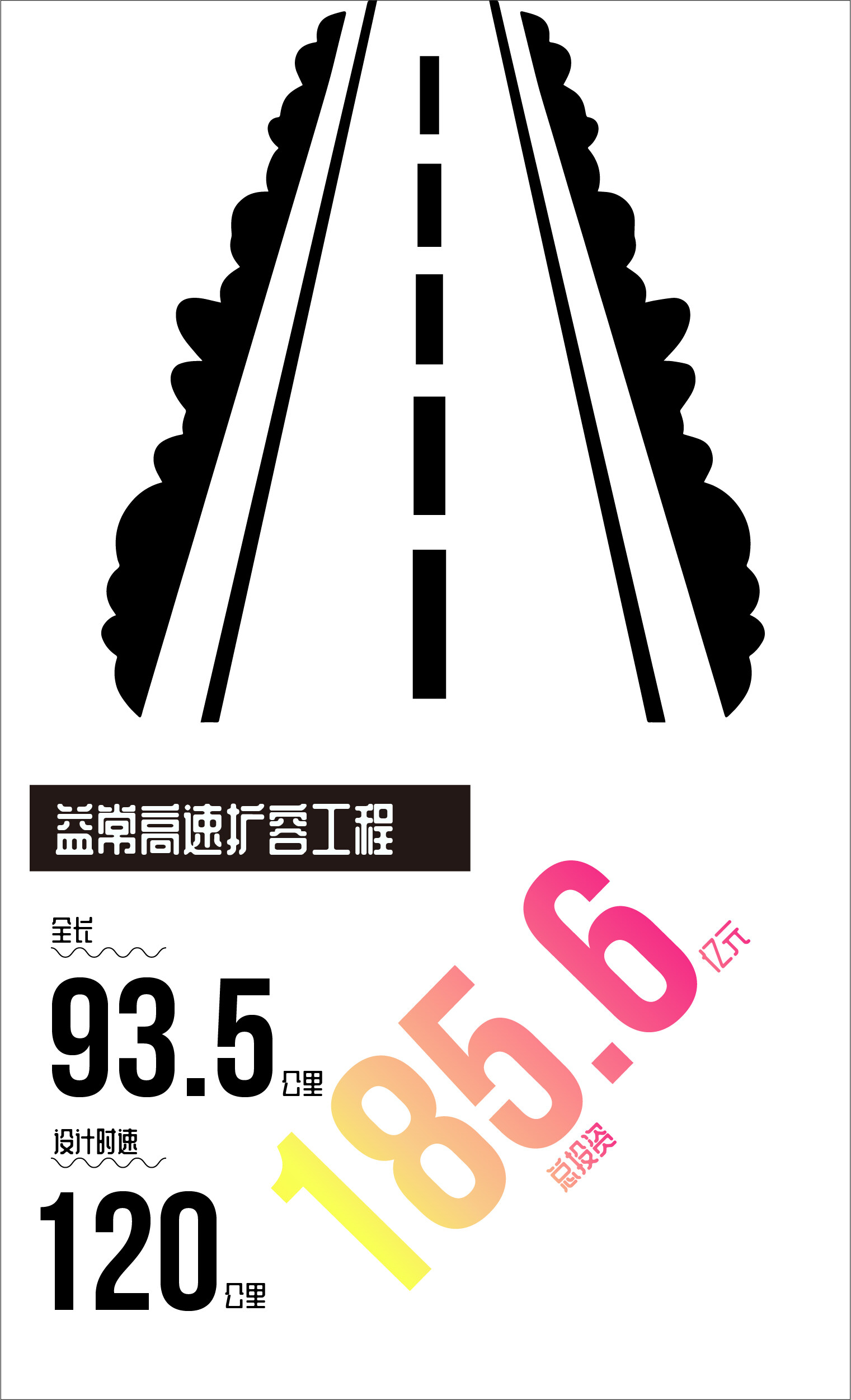益常高速扩容工程全长93.5公里,路线起于长益高速扩容线笔架山互通,止于芦荻山互通接二广高速(常德东环),总投资185.6亿元,共设置9处互通式立交,主线采用双向六车道高速公路标准建设,设计速度120公里/小时。预计2024年建成通车。