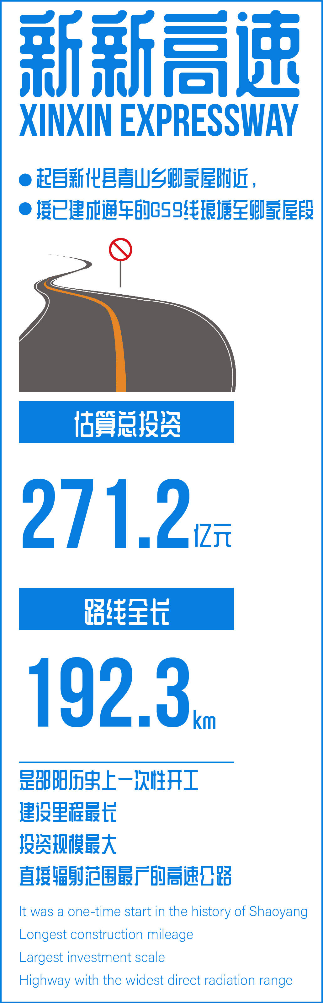 新新高速起自新化县青山乡卿家屋附近,接已建成通车的G59线琅塘至卿家屋段,路线全长约192.3公里,估算总投资为271.22亿元(其中静态总投资255.4亿元)。其中,邵阳境内主线约168.8公里(与在建的白新高速共线14公里),5条连接线55.3公里,12处互通式立交,投资约230亿元,预计2024年建成通车。是邵阳历史上一次性开工建设里程最长、投资规模最大、直接辐射范围最广的高速公路。