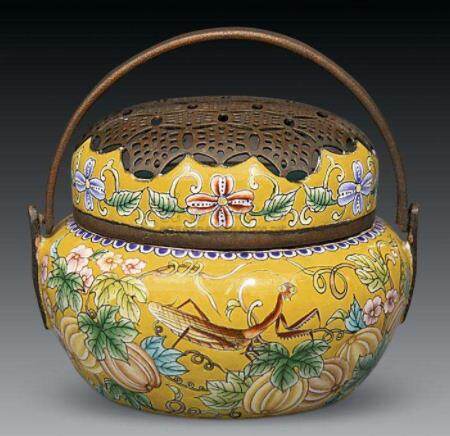 帝后妃嫔们的取暖利器—炭炉和手炉。冬季紫禁城的宫殿内还会陈设炭炉用来取暖,称作熏笼。熏笼的制作十分精美,分为盆和笼两部分。大的熏笼重达数百斤,通高1米多,或3足,或4足,有的是青铜镏金的,有的是掐丝珐琅的,十分华美。