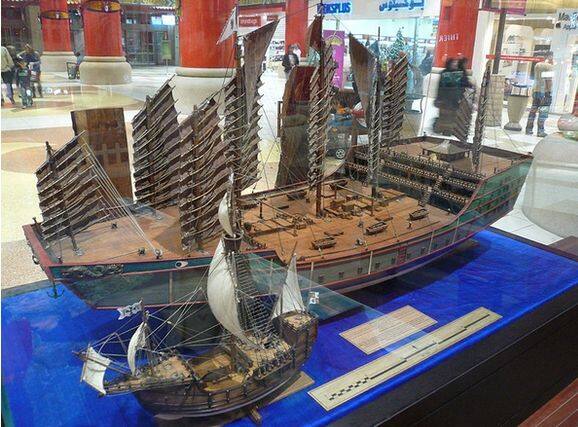 上面是郑和下西洋乘的船,下面是哥伦布探险乘的船