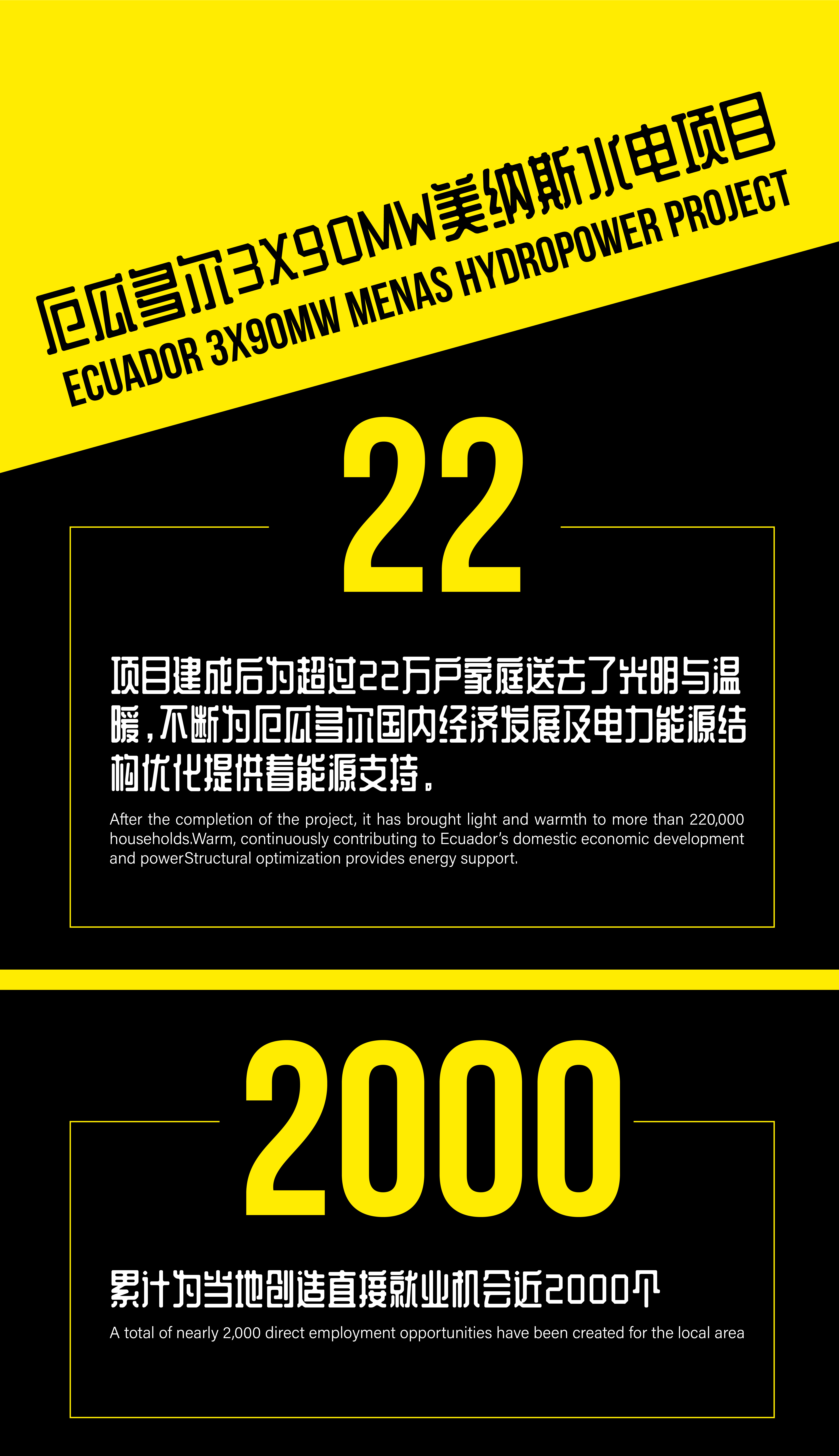 作为哈电集团深耕南美洲电力市场的首个EPC水电项目。项目合同范围主要包括电站土建和输变电线路施工,机电设备设计、制造、供货、安装、调试,以及为期一年半的项目质保期。美纳斯水电项目为“哈电配套”到“哈电制造”的典范工程,项目的主要发电机设备,包括水轮发电机、励磁等系统全部由哈电集团自主设计、制造和供货,其他辅助系统设备也均由中国厂商制造供货。机组并网发电至今,性能优异,配套设备运行安全可靠,以清洁环保的方式持续为厄瓜多尔及南美大地传输源源不断的电力与光明。