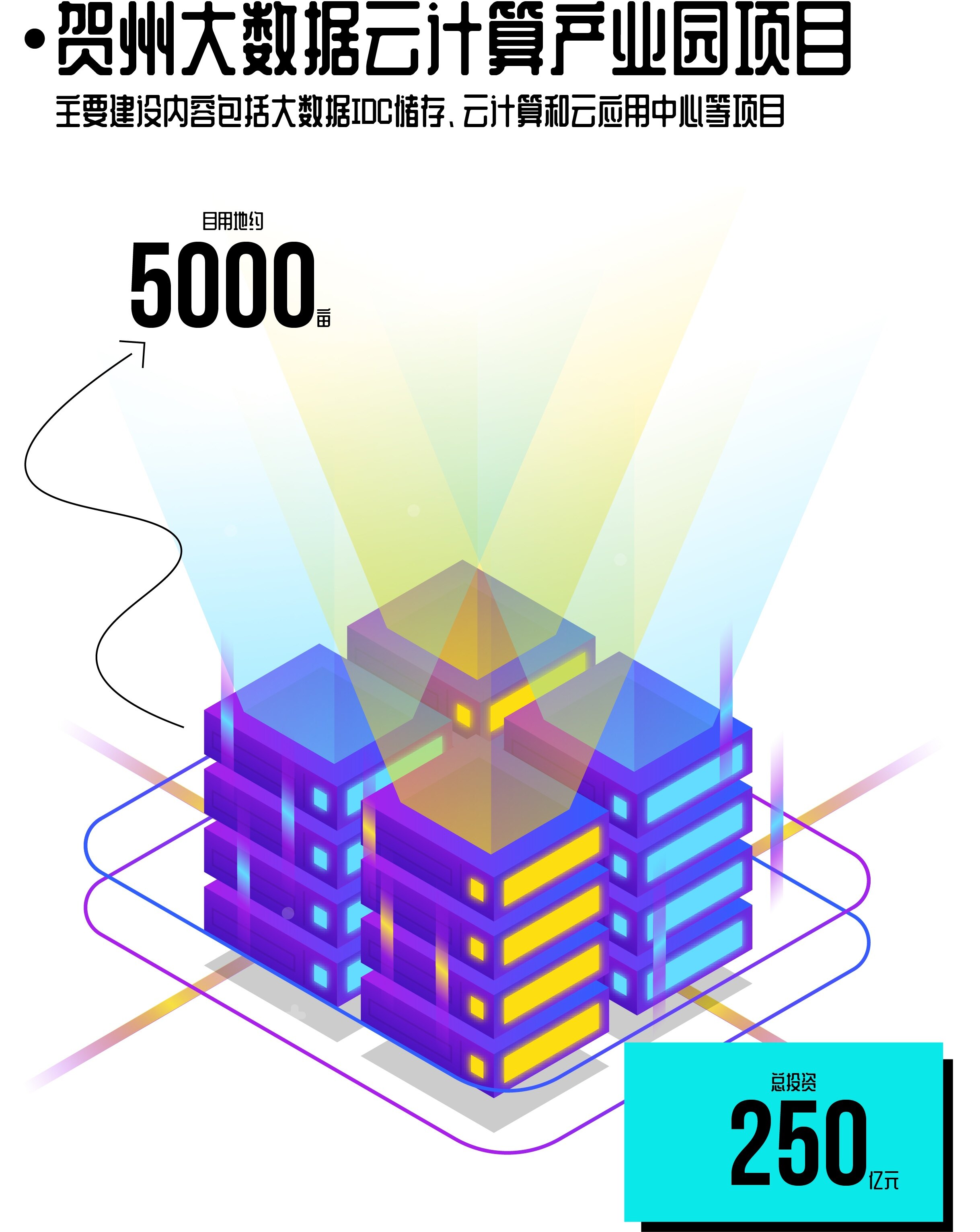 大数据云计算产业园项目用地约5000亩,总投资250亿元。主要建设内容有:大数据IDC储存、云计算和云应用中心、智能制造和智能应用中心,数据研发基地等项目,同时还将进行办公楼、厂房、住宅、污水处理系统、学校等基础配套设施。