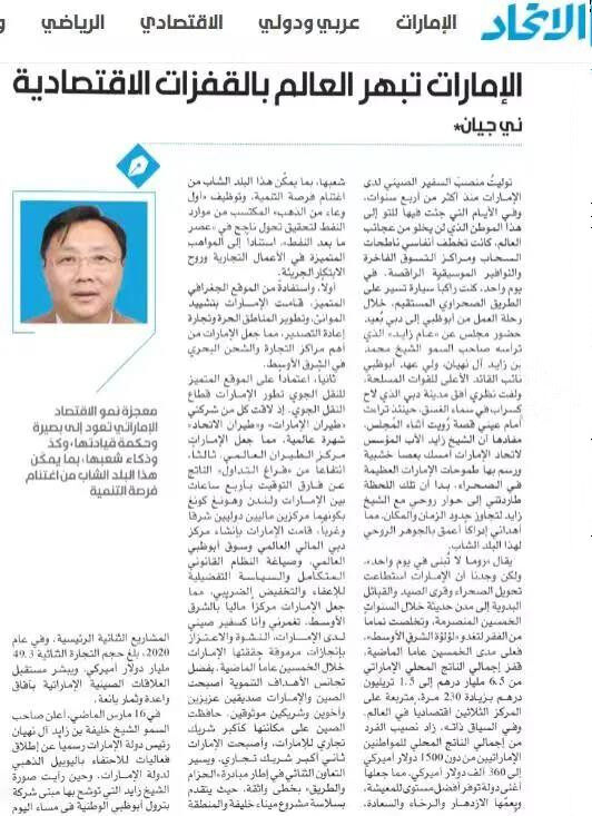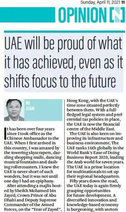 作为中国大使,我由衷为阿联酋50年经济发展取得举世瞩目的成就感到欣喜和赞叹。中阿两国发展路径相似,发展理念相通,发展目标相同,已成为发展合作中优势互补的好朋友、好兄弟、好伙伴。中国继续保持阿联酋第一大贸易伙伴的地位,阿联酋也连续多年成为中国在西亚北非地区的第二大贸易伙伴和第一大出口市场。中阿共建一带一路迈出坚实步伐,哈利法港、中阿产能合作示范园等一大批旗舰项目正稳步推进。2020年面对新冠疫情的严重冲击,中阿双边贸易额达493亿美元,逆势增长1.13%,显示出两国经贸合作的强大韧性和强劲潜力。在中阿发展的未来图景里,你中有我、我中有你,前景可期、大有可为。