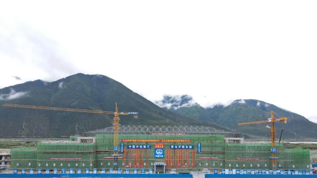 林芝是深藏在藏东南的一颗高原明珠,周围雪山、牧场、湖泊、村寨环绕被誉为“西藏的小瑞士”。林芝站站房总建筑面积14986.7平方米,是拉林铁路全线最大站房。建筑高度27.67米,站台规模2台6线,分为上下两层。是典型的线侧平式站房。林芝站大厅屋面为大跨度钢框架结构。2020年7月10日,项目团队仅用4小时便完成了总长106米,最大跨度43.6米,重量达286吨的钢结构屋面整体提升。技术人员实行提升工作全程数字化操作,采用成熟高效的液压法和“地面原位拼接+整体提升就位”工艺,整个过程一气呵成,实现精准就位。