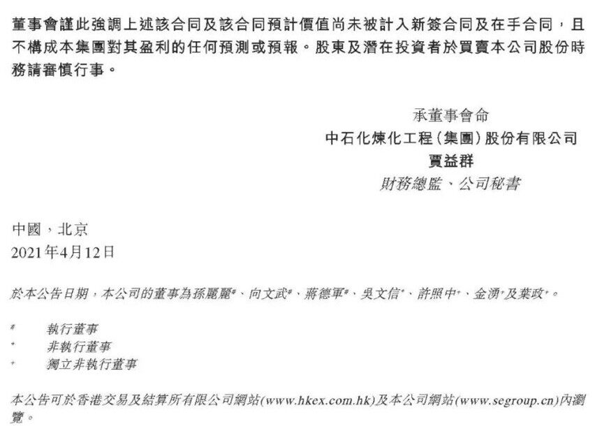 根据该合同,中石化炼化工程集团将就该项目建设向EMHCC公司提供BEPC工程总承包服务,合同主要范围包括全部工艺装置、公用工程及辅助设施的基础设计、详细工程设计、採购和施工。该合同价值预计将达到数十亿美元。