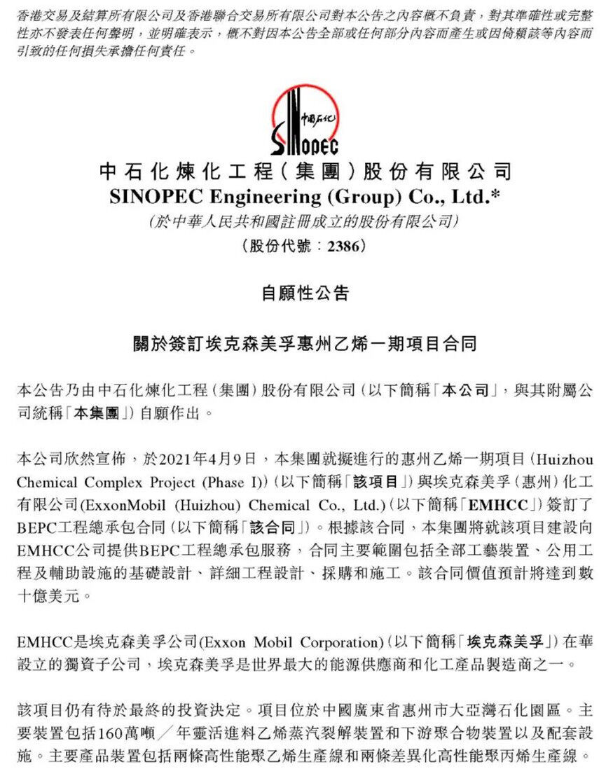 中石化炼化工程集团于2021年4月9日发布公告,集团就拟进行的惠州乙烯一期项目与埃克森美孚(惠州)化工有限公司签订了BEPC工程总承包合同。