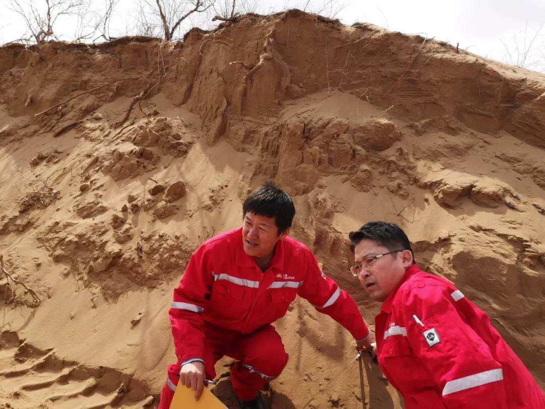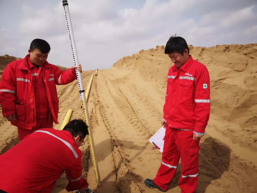 一干人到了现场,突变的大风,让人禁不住浑身打冷颤,细细的沙粒迎面扑来,直往脖子里钻。但这丝毫不能影响干活效率和工作质量。严细验收 经过管线踏勘、作业带扫线、布管焊接等一整套工序后,一条条输气长龙横穿毛乌素沙地多个角落,漫漫黄沙衬托着巍巍钻塔,显得气势磅礴,格外耀眼。验收工作开始了。技术负责人核对手中的管线数据,组织逐点测量,用测距仪反复丈量长度、宽度、高度,确认数据。